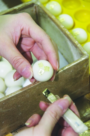 很多人都知道,最極品的安宮牛黃丸外面裹著一層薄薄的金箔,取其墜痰鎮(zhèn)固的功效,這也是同仁堂的“獨(dú)門秘笈”。記者在安宮牛黃丸生產(chǎn)線看到,工人師傅拿過一張不及郵票大的金箔,將藥丸放在上面輕輕一推,就輕巧、均勻地給小藥丸“穿上了金衣”?!肮鸩瓷先ポp巧,可其中的技巧卻不簡單。推藥丸時(shí),勁兒大了,金箔就會被藥丸吃進(jìn)去,勁兒小了則包得不瓷實(shí)。手愛出汗的人還干不了這道工序?!睆埗氛f,一個(gè)工人想要把這道工序干好,至少要練半年。