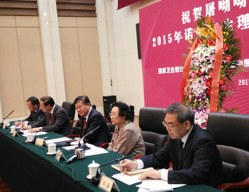 當日,國家衛生和計劃生育委員會、國家中醫藥管理局、國家食品藥品監督管理總局共同舉辦座談會,祝賀屠呦呦研究員榮獲2015年諾貝爾生理學或醫學獎。