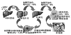 乙肝病毒感染是導致肝硬化和肝癌的重要原因。如果沒有規范的治療,慢性乙型肝炎患者發展為肝硬化的幾率大約為每年2%~10%,5年累積肝硬化發生率大約12%~25%;代償期肝硬化患者如果不治療,每年有3%~5%的患者進展為失代償期肝硬化或肝功能衰竭;失代償期肝硬化或肝衰竭的患者5年生存率僅為14%~35%,有65%~86%的患者死亡,或需要做肝移植手術(見附圖)。