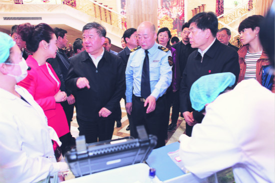 圖為5月5日,陳竺(左三)率執法檢查組在齊齊哈爾市的一家大型餐飲企業檢查該企業自檢情況。(張 超 岳海為 攝)