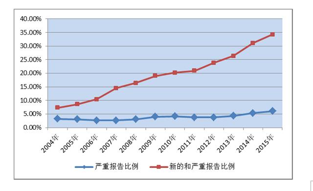 圖2 2004年-2015 年新的和嚴(yán)重以及嚴(yán)重藥品不良反應(yīng)/事件報(bào)告比例
