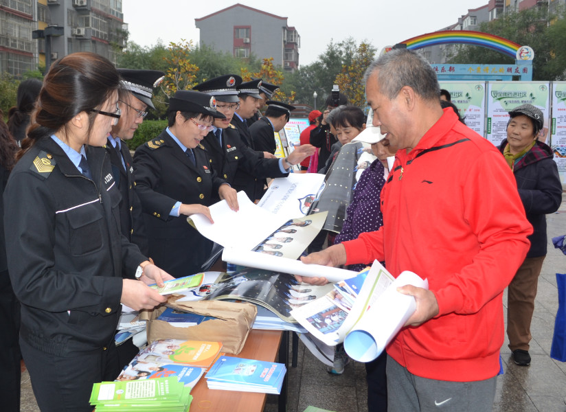 圖為順義區食藥監管局工作人員向居民發放宣傳資料。 王東海 攝