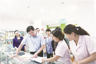 圖為柯俊(左二)在健康世紀(jì)大藥房檢查藥品購進臺賬/攝影報道 顏學(xué)文 楊芳芳