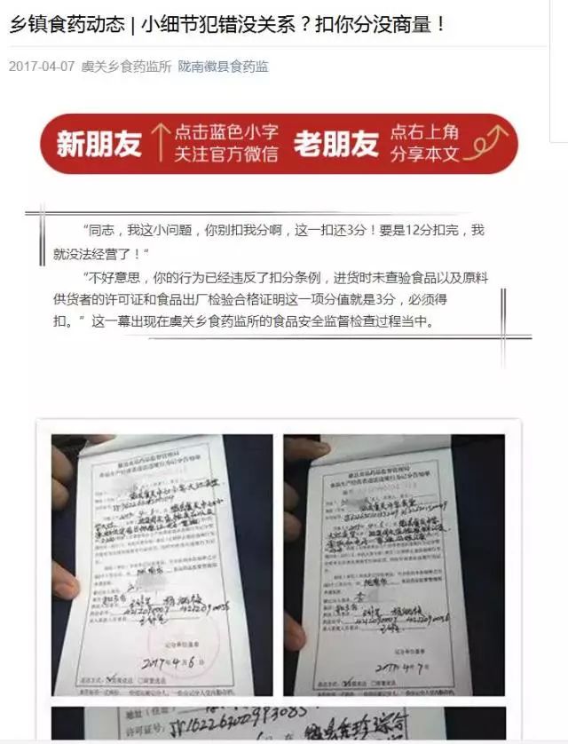 如加入熱點(diǎn)元素、超級(jí)話題,也就是“蹭熱點(diǎn)”。尤其在三線小城鎮(zhèn),當(dāng)?shù)氐臒衢T話題會(huì)引起更好的反響,在這個(gè)思路下,我們創(chuàng)作了《圍觀!不一樣的家長(zhǎng)會(huì)!》、《驚!村民來(lái)到鎮(zhèn)食藥監(jiān)所辦事,嚇了一跳!》《逛吃,逛吃,吃的安心,廟會(huì)才能逛的開心!》等閱讀量和點(diǎn)贊量較高的推送。有時(shí)甚至從整篇文章中,只提煉一個(gè)亮點(diǎn),轉(zhuǎn)變整個(gè)文章的重心。如《小細(xì)節(jié)犯錯(cuò)沒關(guān)系?扣你分沒商量!》把一篇紀(jì)實(shí)類的日常檢查報(bào)道稿,改成了針對(duì)食品記分管理工作進(jìn)行宣傳普及的推送。