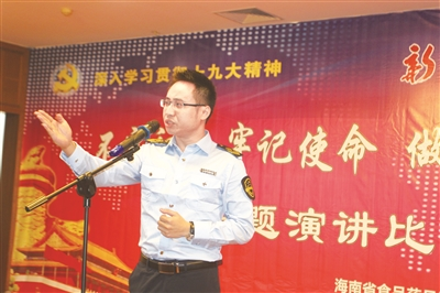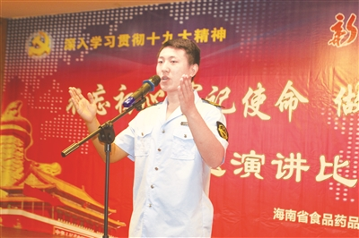 成績的背后是奉獻(xiàn)和付出。近日,海南省食品藥品監(jiān)管局為深入貫徹學(xué)習(xí)黨的十九大精神,舉辦了“不忘初心 牢記使命 做新時代的食藥監(jiān)衛(wèi)士”演講比賽。比賽中,選手們講述了海南食藥監(jiān)管人在工作中的故事:他們或冒著危險,沖在執(zhí)法第一線,與食藥違法犯罪行為作斗爭;或為了讓人民群眾吃上放心、安全的食品藥品,日復(fù)一日、年復(fù)一年,盡職盡責(zé)地在街頭巡查,自己卻很難和父母、兒女好好坐下來吃一頓飯……來,讓我們聽聽他們口中的海南食藥監(jiān)管故事吧。