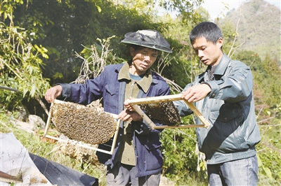 廣西壯族自治區食品藥品監管局駐老圩場村“第一書記”李海舜(右)與貧困戶一起探索養蜂技術/攝影 李舒雯