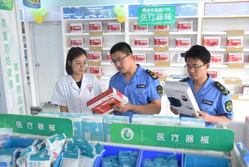 圖為高唐縣食藥監局執法人員近日在百年康潤大藥店檢查醫療器械質量安全情況。李慧 攝