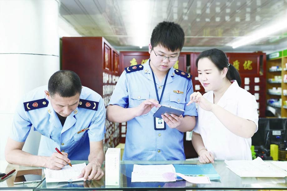 圖為諸暨市市場監管局大唐分局執法人員運用“綜合監管平臺”對藥店進行檢查。