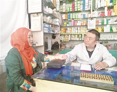 正午時分,驕陽似火,甘肅省臨夏市南龍街街頭行人稀少,安靜得能聽到蟲鳴聲。但南龍街一家診所內卻是一派繁忙景象。患者從室內排到了門口,在人群中間,有一位和藹可親、語速緩慢的醫生,正在給看病的老人量血壓,他就是診所負責人翁宏強。