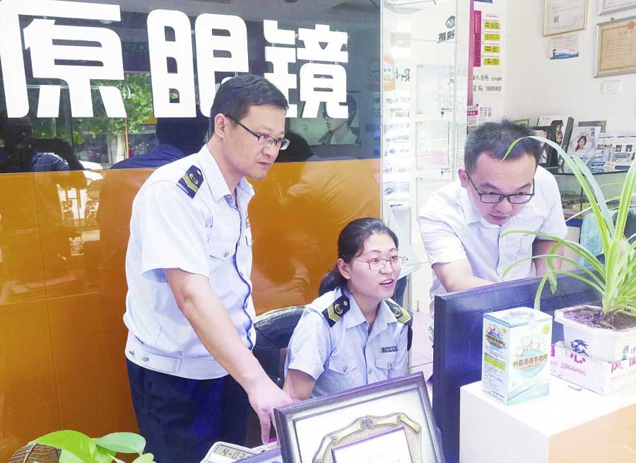 檢查人員正在調(diào)取濟南市長清區(qū)中原眼鏡店經(jīng)營的隱形眼鏡的相關(guān)記錄