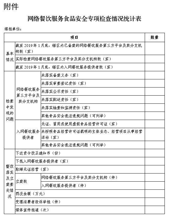 請各省級食品安全監管部門于2019年1月底前,將專項檢查工作總結及統計表(見附件)的紙質版、電子版報送至市場監管總局食品經營安全監督管理司。