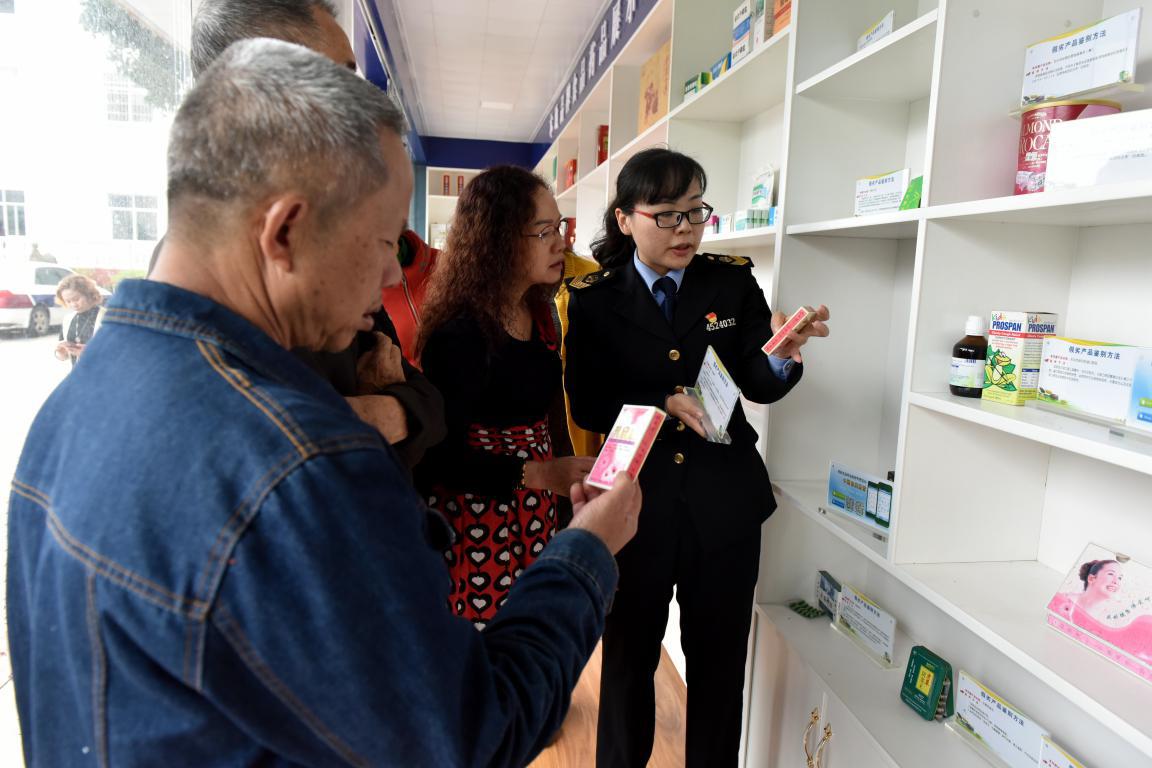 圖為講解員向參觀群眾講解真假藥鑒別方法。