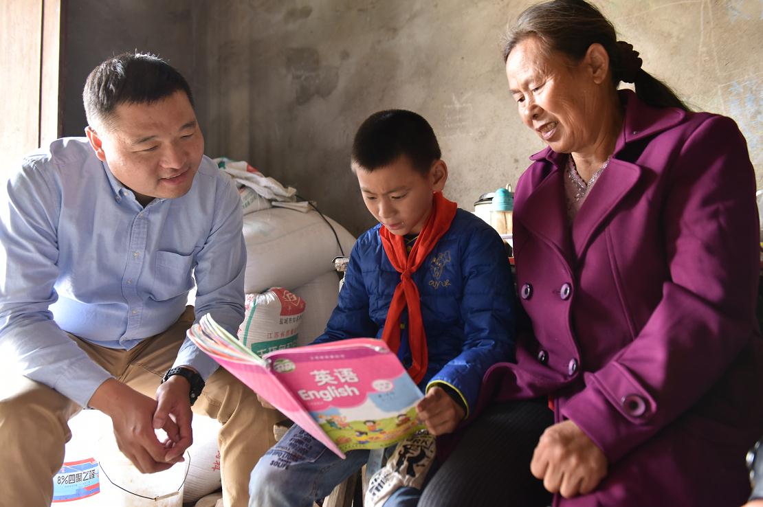 江蘇省鹽城市阜寧縣東溝中心小學(xué)三年級(jí)學(xué)生單澤華常年與奶奶一起生活,家里非常困難。在東溝鎮(zhèn)嵩乳村幫扶的鹽城市食品藥品監(jiān)管局干部沈剛(左一)多方籌集資金,幫扶這個(gè)家庭,并經(jīng)常關(guān)心孩子的學(xué)習(xí)和生活。蔣曉鵬 攝