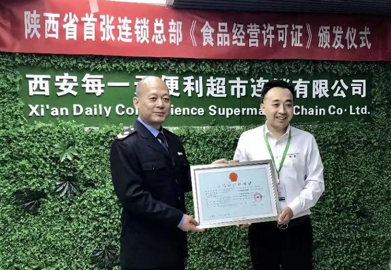 每一天便利超市連鎖有限公司董事長張培彥從陜西省食藥監局副局長任彥保手中接過連鎖總部《食品經營許可證》。