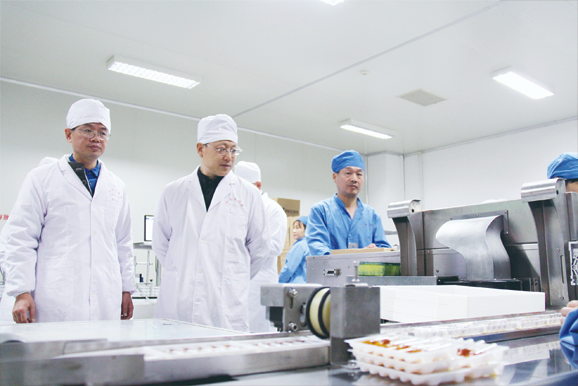 圖為趙子忠(左二)一行在天施康余江分公司察看藥品生產情況。本報記者 譚彩丹 通訊員 王超 攝影報道