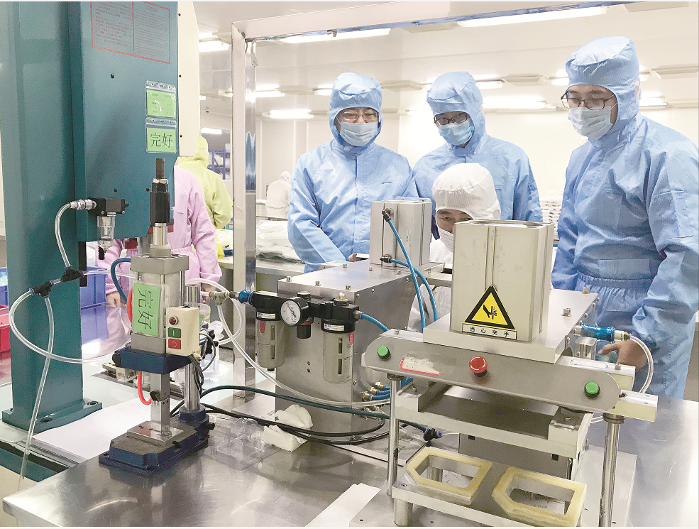 圖為揚州市食藥監局醫療器械檢查員在一家醫療器械企業檢查工作人員是否按規程操作(揚州市食藥監局供圖)