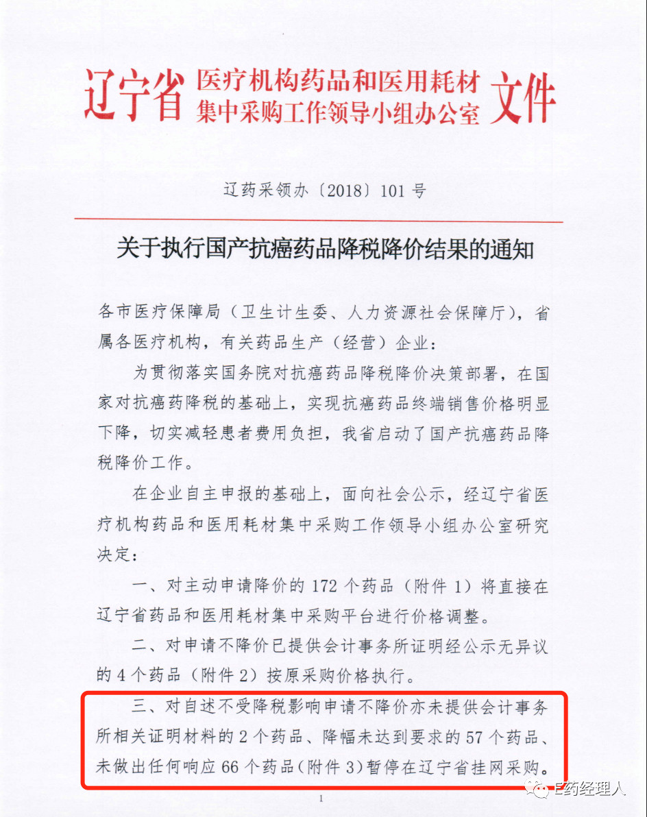 被暫停掛網采購的原因,是這些產品未能滿足11月29日遼寧省在《關于進一步做好抗癌藥品降稅降價工作的通知》提出的要求。這些產品或是未對降價要求作出任何響應,或是降幅未達到指定要求,還有的品種申請不降價但未提供足夠的證明材料。