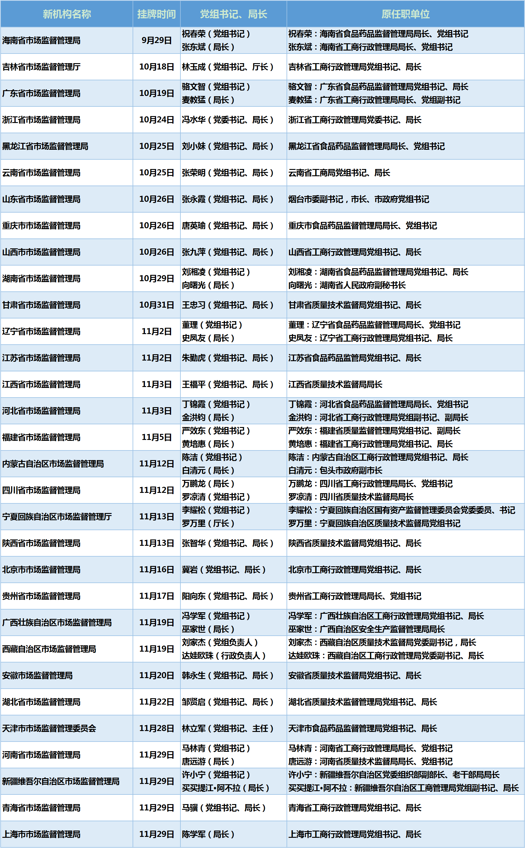 根據各省機構改革具體實施方案和時間表,9月29日海南省市場監管局掛牌成立,11月22日上海市十五屆人大常委會第七次會議表決通過了人事任免案。至此,全國31個省級市場監督管理機構均已正式掛牌成立,新領導班子陸續履新。據統計,原工商行政管理部門負責人擔任黨政一把手或者局長、黨組書記的達半數以上。
