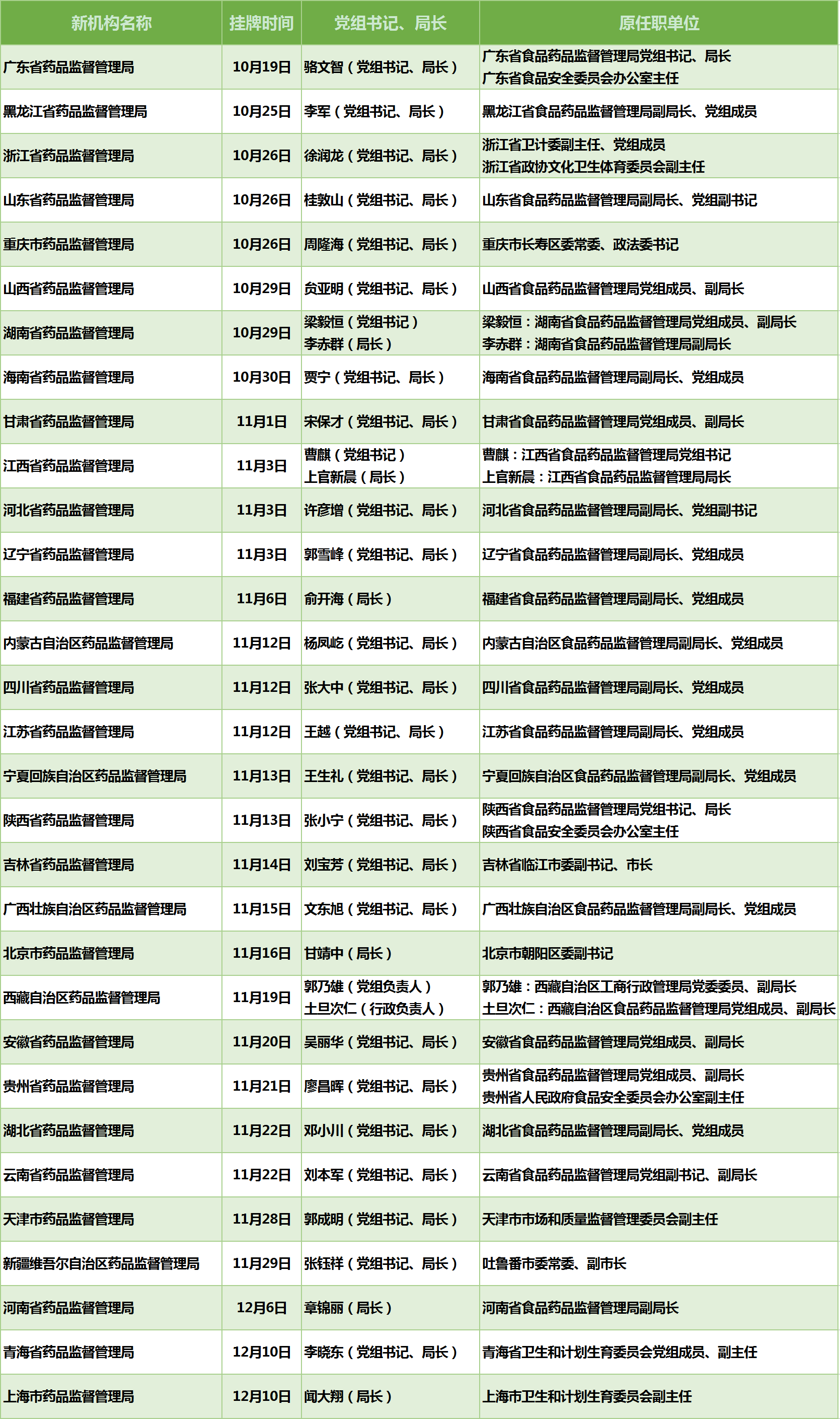 根據各省機構改革具體實施方案和時間表,10月19日廣東省藥品監管局掛牌成立,12月10日青海省藥品監督管理局掛牌履職。至此,全國31個省級藥品監督管理局均已正式掛牌成立,新領導班子陸續履新。據統計,大部分省份的黨組書記、局長來自原食品藥品監督管理局。