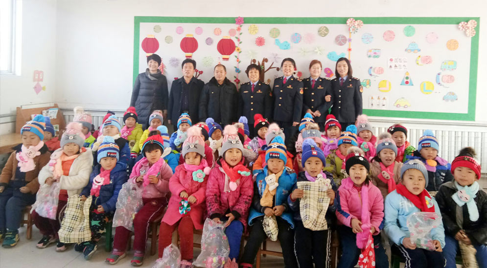 近日,廣饒縣市場監管局婦委會聯合局機關黨建辦、大碼頭鎮桑一村駐村第一書記來到鎮春苗幼兒園,為107名孩子送去帽子、圍巾和手套等春節禮物,讓農村娃感受社會大家庭的溫暖。肖東津 崔秀珍 張益魁 攝影報道