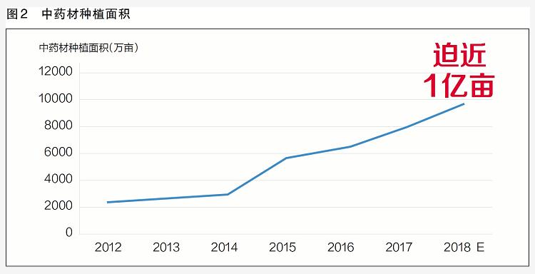 經過30多年的發展,我國藥材種植生產初步完成集約化、規模化,南北藥材區劃基本形成。當前,全國中藥材種植面積已接近1億畝(見圖2),藥材供給大大超出了需求,但因其質量千差萬別,導致部分優質品種往往供不應求。