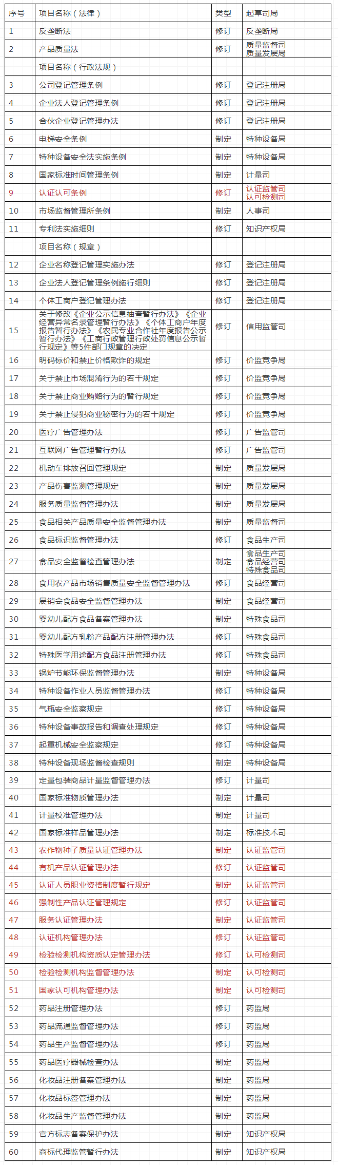 1.為加強市場監管法治建設,統一規范市場監管法律制度,制定《國家市場監督管理總局規章制定程序規定》《市場監督管理行政許可實施辦法》《市場監督管理部門執法監督規定》《市場監督管理行政執法證管理辦法》。(法規司起草)