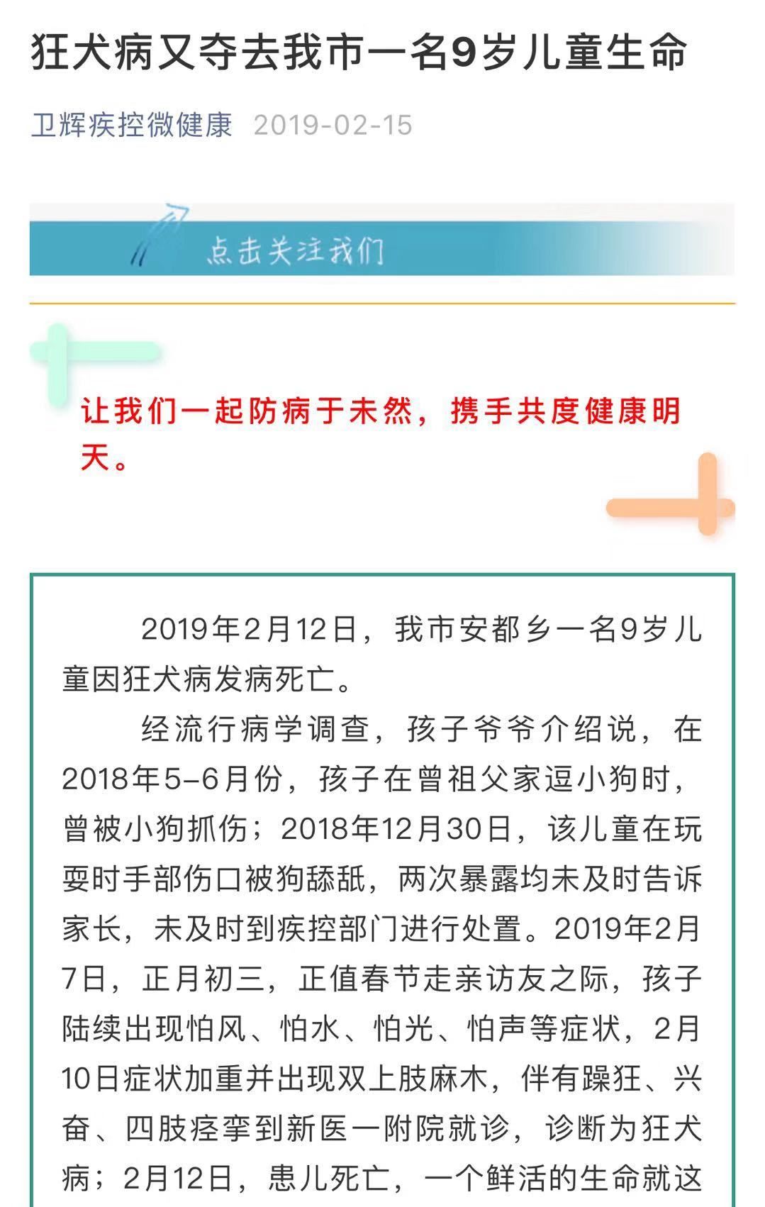 內容顯示,在2018年5-6月份,男孩曾被小狗抓傷,2018年12月30日,該兒童在玩耍時手部傷口被狗舔舐,兩次暴露均未及時告訴家長,未及時到疾控部門進行處置。2019年2月7日,孩子陸續出現怕風、怕水、怕光、怕聲等癥狀,2月10日癥狀加重并出現雙上肢麻木,伴有躁狂、興奮、四肢痙攣到新醫一附院就診,診斷為狂犬病,2月12日,患兒死亡。