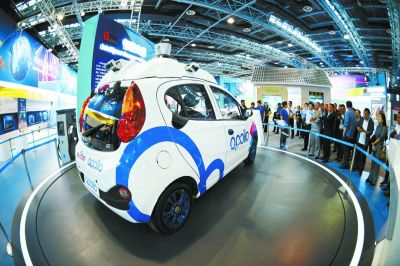 參觀者在北京中關村國家自主創新示范區展示中心參觀自動駕駛汽車(2018年9月27日攝)。新華社記者 鞠煥宗攝