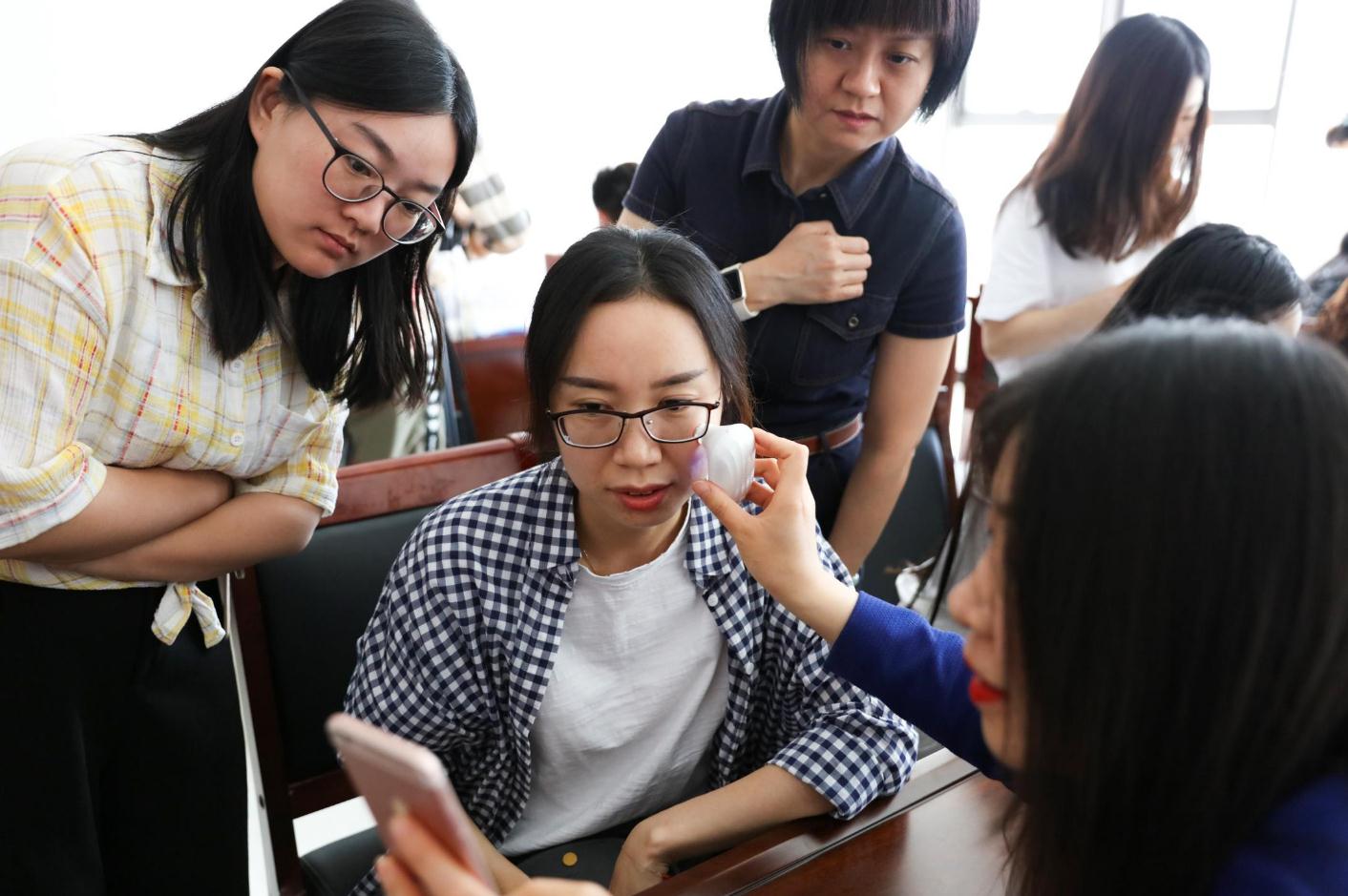 圖為玫琳凱工作人員為參加活動的公眾做皮膚健康檢測,并耐心講解皮膚日常保養及合理使用化妝品的相關知識。馮歡歡 攝