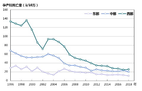 地區差距持續縮小。2018年,東、中、西部地區孕產婦死亡率分別為10.9/10萬、20.0 /10萬、25.2/10萬,與1996年相比,分別下降了61.9%、70.5%、81.2%。1996年西部地區孕產婦死亡率是東部地區的4.7倍,2018年降至2.3倍(圖3)。