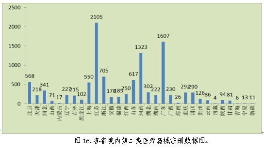 從注冊(cè)情況看,江蘇、廣東、河南、浙江、山東、北京、上海七省(直轄市)注冊(cè)的境內(nèi)第二類醫(yī)療器械數(shù)量較多。第二類醫(yī)療器械注冊(cè)具體數(shù)據(jù)見表1及圖16。