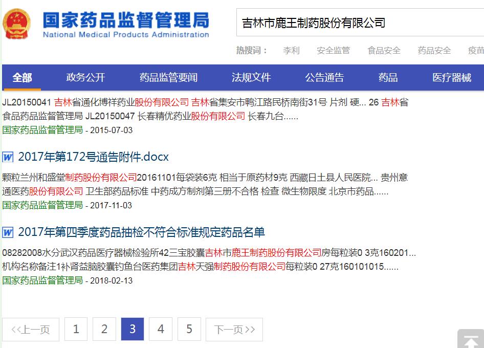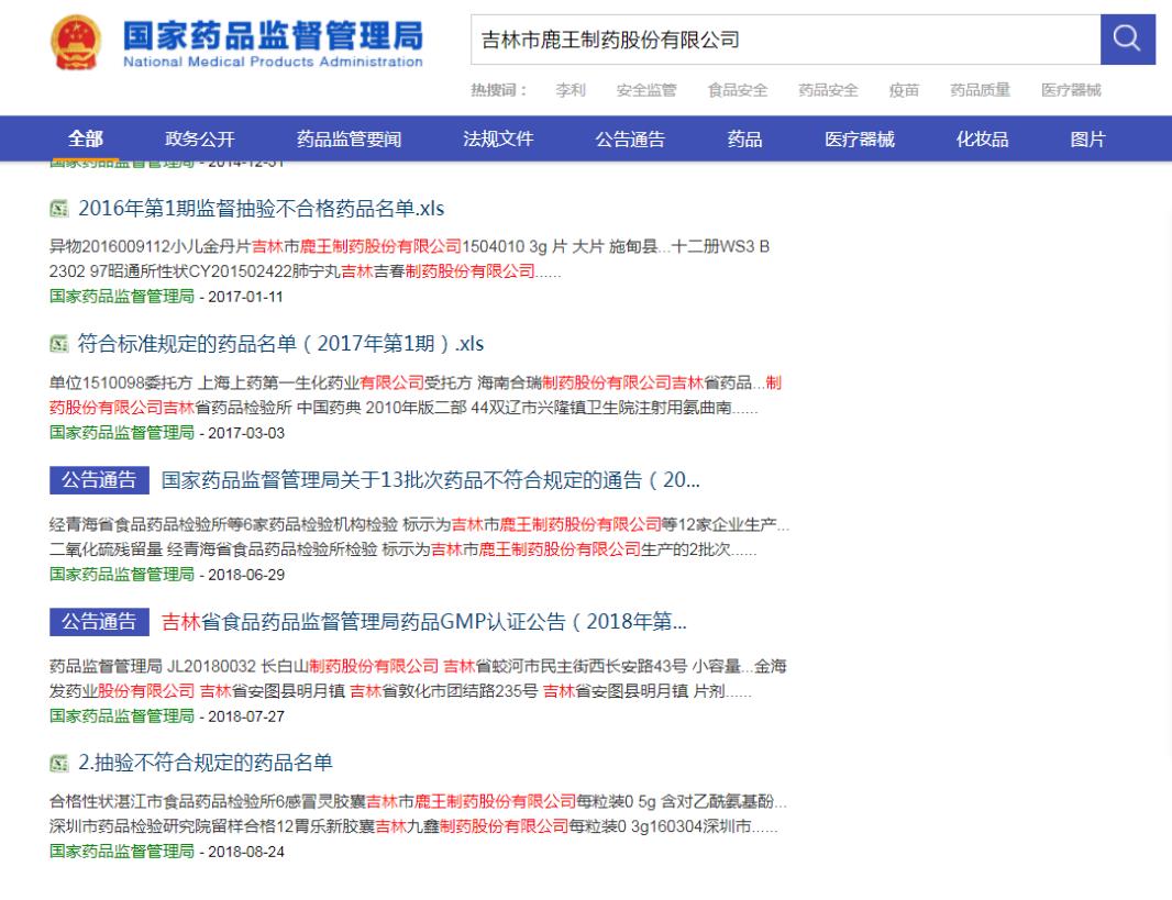 記者查閱國(guó)家藥監(jiān)局官網(wǎng)得知,在2018年8月24日、2018年7月3日、2018年2月13日、2017年1月11日國(guó)家藥品監(jiān)管部門發(fā)布的藥品不合格名單與不符合標(biāo)準(zhǔn)規(guī)定的藥品名單中,都出現(xiàn)了標(biāo)示為吉林市鹿王制藥股份有限公司生產(chǎn)的產(chǎn)品。