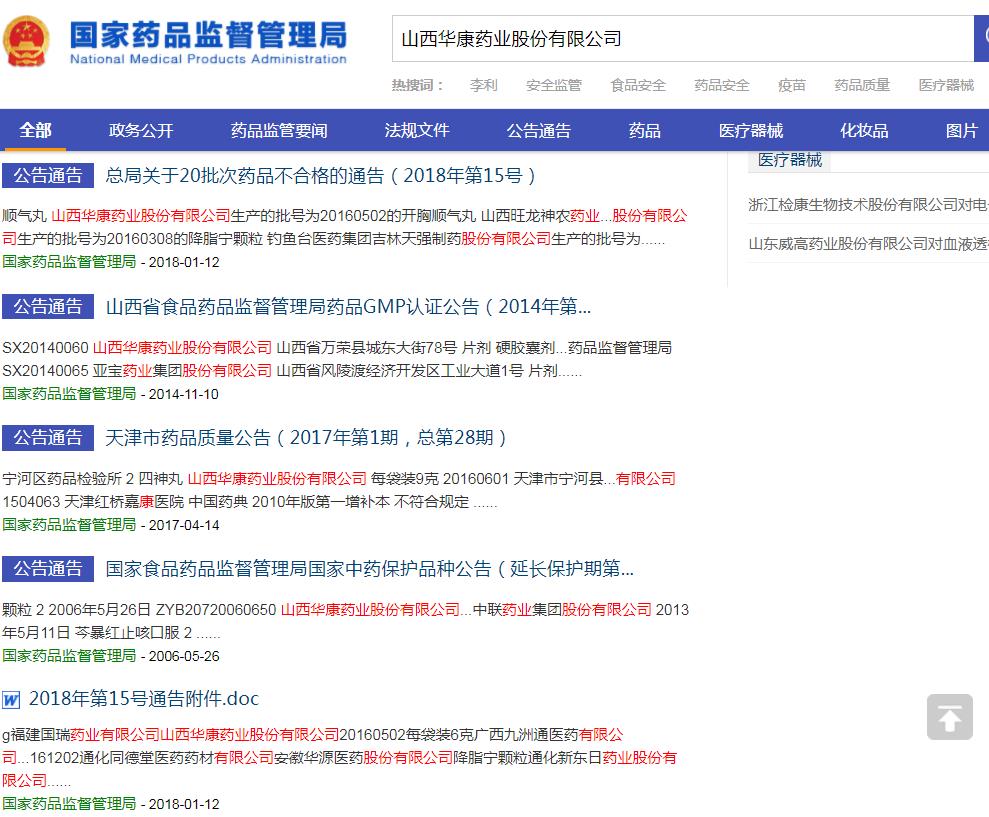 2018年1月12日,原國(guó)家食藥監(jiān)總局官網(wǎng)發(fā)布《總局關(guān)于20批次藥品不合格的通告(2018年第15號(hào))》。該通告顯示,經(jīng)廈門市食品藥品質(zhì)量檢驗(yàn)研究院檢驗(yàn),標(biāo)示為山西華康藥業(yè)股份有限公司生產(chǎn)的批號(hào)為20160502的開胸順氣丸不合格,不合格項(xiàng)目為水分。