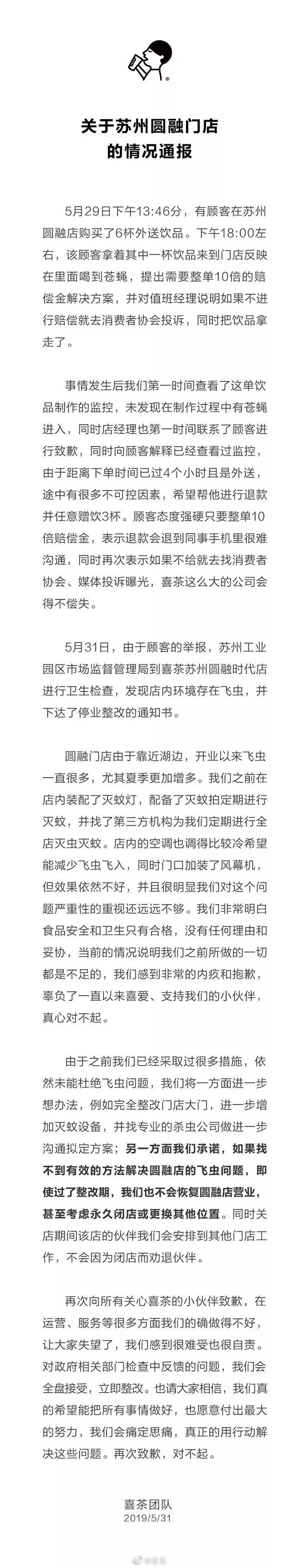 5月31日19時,深圳喜茶投資有限公司官微@喜茶對蘇州圓融店具體情況進行了通報,并向廣大消費者道歉。喜茶方面表示,第一時間查看相關監控后,未發現制作過程中有蒼蠅進入,由于上述顧客的購買方式為外送且已過4小時,“途中有很多不可控因素”。喜茶同時認為,食品安全和衛生只有合格,沒有任何理由和妥協。如果找不到有效的方法解決圓融店的飛蟲問題,就不會恢復圓融店營業甚至考慮永久閉店或更換其他位置。對政府相關部門檢查中反饋的問題,會全盤接受立即整改。界面新聞、東方財富網等新聞網站,@每日經濟新聞、@ 36氪等微博賬號均轉載了相關信息。少量網民對喜茶的道歉并不認可,認為喜茶是在找借口。