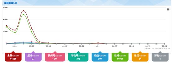 以5月31日~6月19日為監測時間段,輿情出現兩個峰值,網民關注度遠高于媒體關注度。