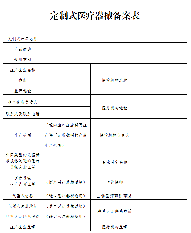 第八條 醫療器械生產企業及醫療機構共同作為定制式醫療器械備案人,在生產、使用定制式醫療器械前應當向醫療器械生產企業所在地(進口產品為代理人所在地)省、自治區、直轄市藥品監督管理部門備案。備案資料符合形式要求的,省、自治區、直轄市藥品監督管理部門當場予以備案(見附1—3)。備案資料不齊全或者不符合規定形式的,應當一次告知需要補正的全部內容。對不予備案的,應當告知備案人并說明理由。