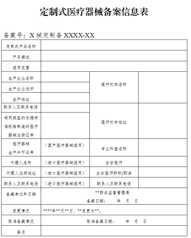 已備案的定制式醫療器械,備案信息表(見附2)登載內容發生變化的,備案人應當提交變化情況的說明及相關證明文件,向原備案部門變更備案信息。備案資料符合形式要求的,省、自治區、直轄市藥品監督管理部門應當在變更情況欄中載明變化情況。