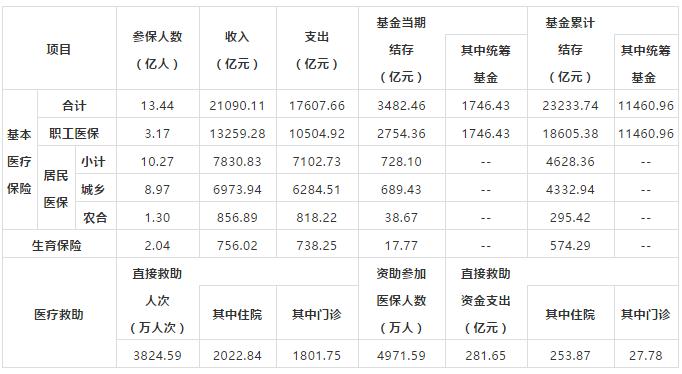 全年職工基本醫療保險基金收入13259.28億元,增長8.7%;基金支出10504.92億元,增長11.5%。年末累計結存18605.38億元,其中統籌基金累計結存11460.96億元。