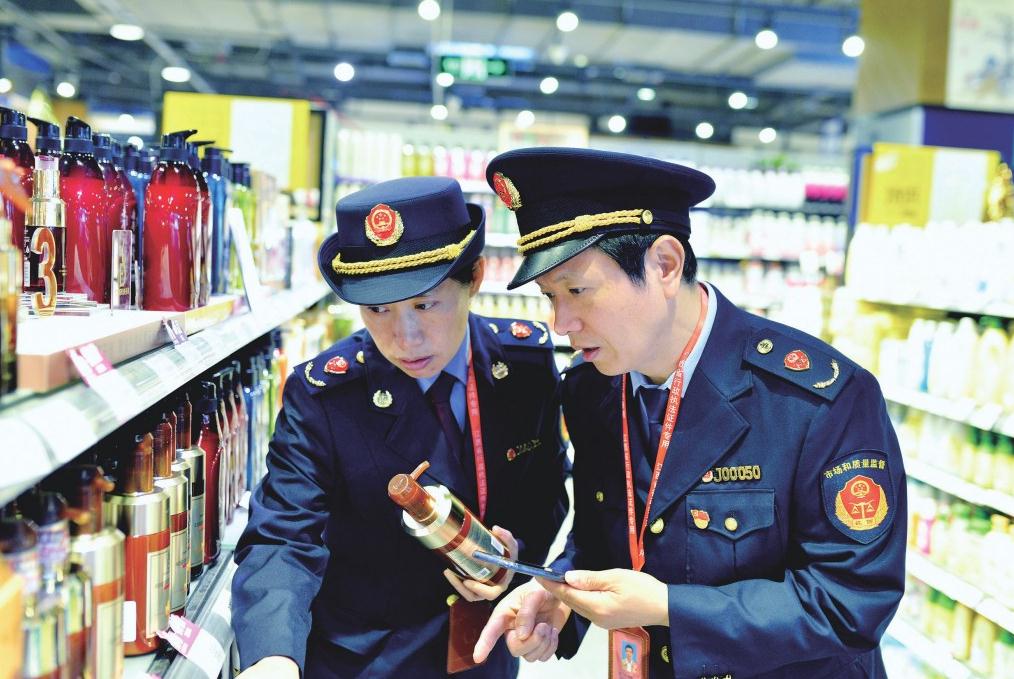 圖為執法人員在一家大型超市檢查化妝品網上備案情況。黃躍輝 攝
