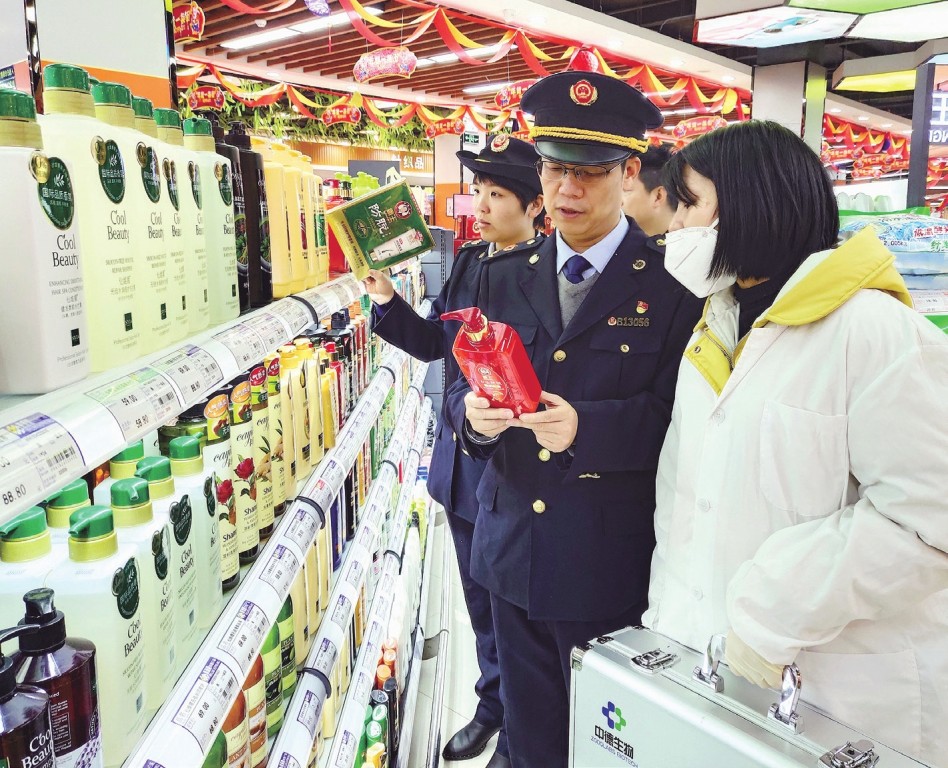 近日,江西省于都縣市場監管局組織開展了超市、商場、專賣店、藥店化妝品安全檢查,重點對祛斑美白、祛痘、面膜、防曬類化妝品及燙染發產品進行針對性檢查,及時發現化妝品安全隱患,保障產品質量安全。圖為該局執法人員在一家超市檢查。王雨林 謝峰 攝