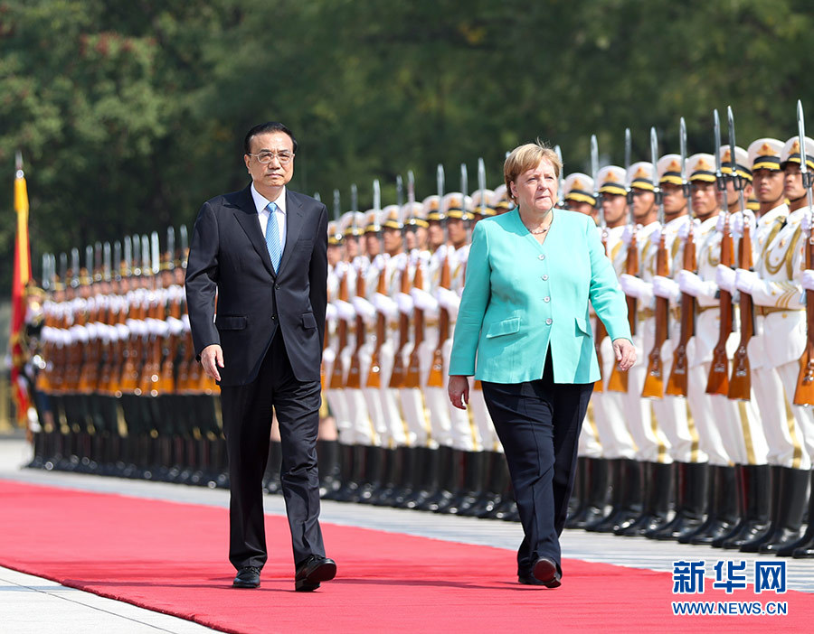 會談前,李克強在人民大會堂東門外廣場為默克爾舉行歡迎儀式。