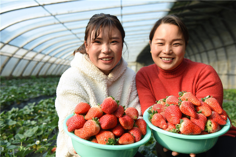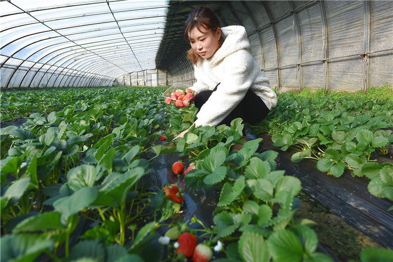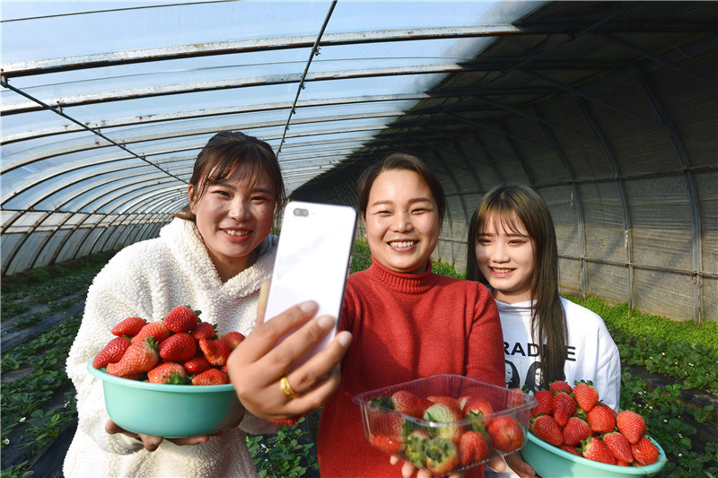 2019年12月17日,江蘇省連云港市東海縣黃川鎮中國國家地理標志產品保護“黃川草莓”融合農旅扶貧項目“莓”不勝收。(張玲 攝)