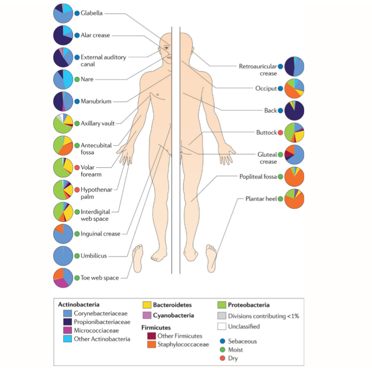 從皮膚生態系統角度來看,皮膚不僅僅扮演著人體與外界環境之間物理屏障的角色,皮膚本身還具有環境的特性,具體體現在為豐富多樣的皮膚微生物提供了生存和居住的場所(圖1.各部位皮膚微生物分布圖)。例如,皮膚有油脂豐富的環境,主要集中在額頭、鼻翼和背部;皮膚有屬性潮濕的環境,主要集中在腋窩,腳趾;皮膚有屬性干燥的環境,集中在手掌和臀部;皮膚有密度多樣化的環境,集中在毛囊、皮膚皺紋。正如駱駝生存在沙漠,熱帶植物生存在熱帶雨林一樣,不同的微生物依據自己生存的屬性也會選擇不同的皮膚環境,例如痤瘡丙酸桿菌喜好油脂豐富的環境,葡萄球菌和棒狀桿菌喜好屬性潮濕的環境。不同的微生物和微生物之間,不同的皮膚環境和微生物之間也時刻進行著物質交換和能量流動,相互作用、相互影響,共同維持著皮膚的動態平衡。