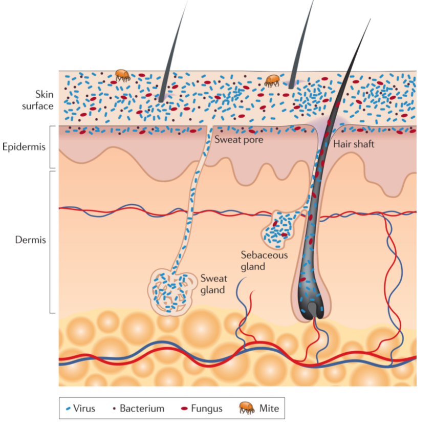 總之,我們可以將表皮理解為由皮膚細胞、不同組織、各類分泌物構成的皮膚環境和多樣的微生物共同構成的生態系統,簡稱皮膚微生態(圖2.皮膚微生態模型圖)。