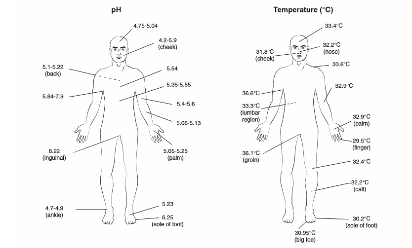 性別、年齡、季節、種族、心情、壓力、內分泌、代謝、生活習慣都能影響皮膚的微生物多樣性、皮膚的微環境,進而影響皮膚微生態。例如,過量飲酒會引起機體抵抗力下降、營養缺失,進而影響皮膚微生物菌群的平衡,導致皮膚屏障能力的下降和感染機會增加。過于頻繁的清洗也會擾亂皮膚的菌群平衡,加大皮膚敏感可能性。又例如,皮膚表面的pH范圍是4.2到7.9,皮膚溫度范圍是29.5攝氏度到36.6攝氏度,不同的溫度和pH可以促進或者抑制微生物的生長(圖4.正常皮膚pH與溫度的分布圖)