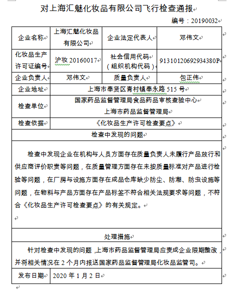飛檢通報(bào):對(duì)上海匯魅化妝品有限公司飛行檢查通報(bào)