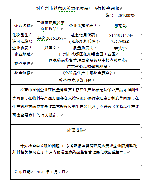 飛檢通報:對廣州市花都區英濤化妝品廠飛行檢查通報