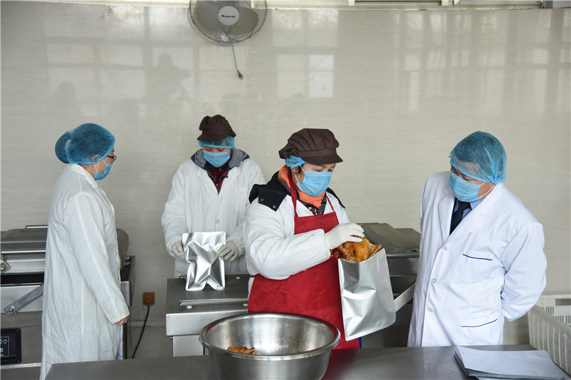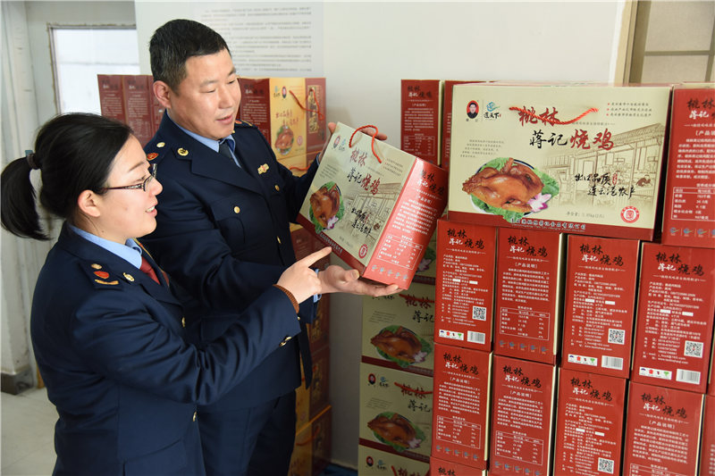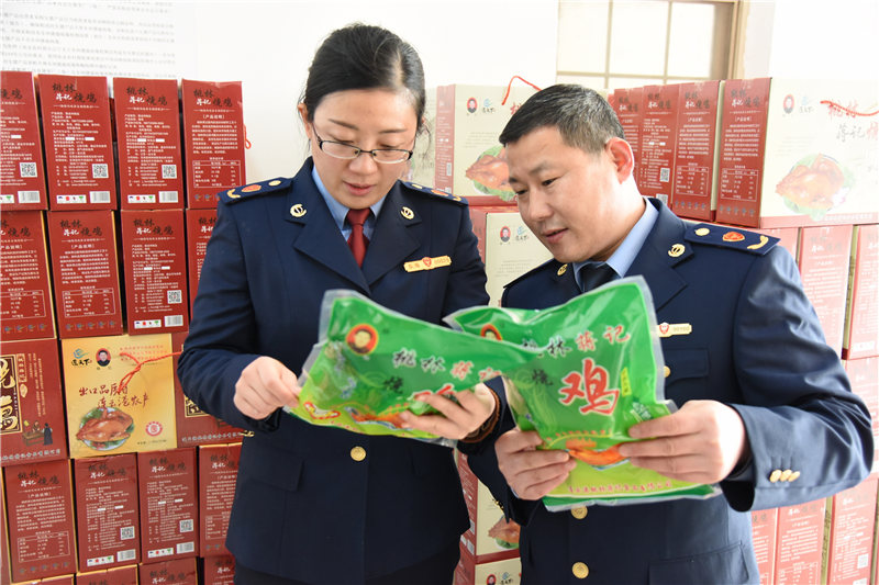 東海縣市場監管局行政執法人員正在對鹵肉食品年貨進行質量把關。(張正友 攝)