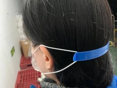 醫護人員采用牛奶盒提手降低耳掛式口罩對耳部的壓力(圖片轉自新華社)