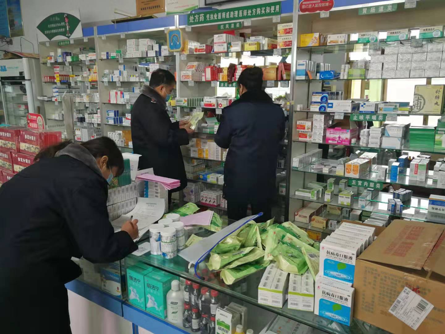 圖為執法人員在藥店進行檢查。